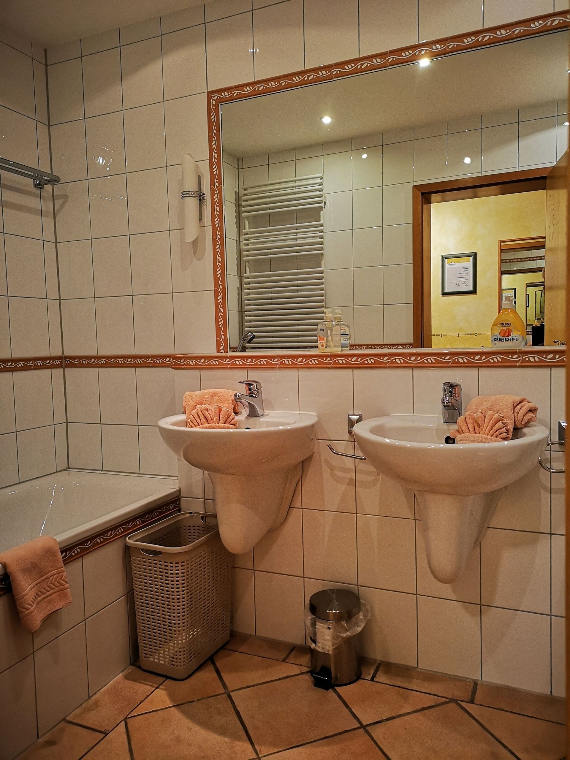 - Ein Bad mit zwei Waschbecken, Badewanne, Dusche, WC, Badheizkörper als Handtuchtrockner, Fön