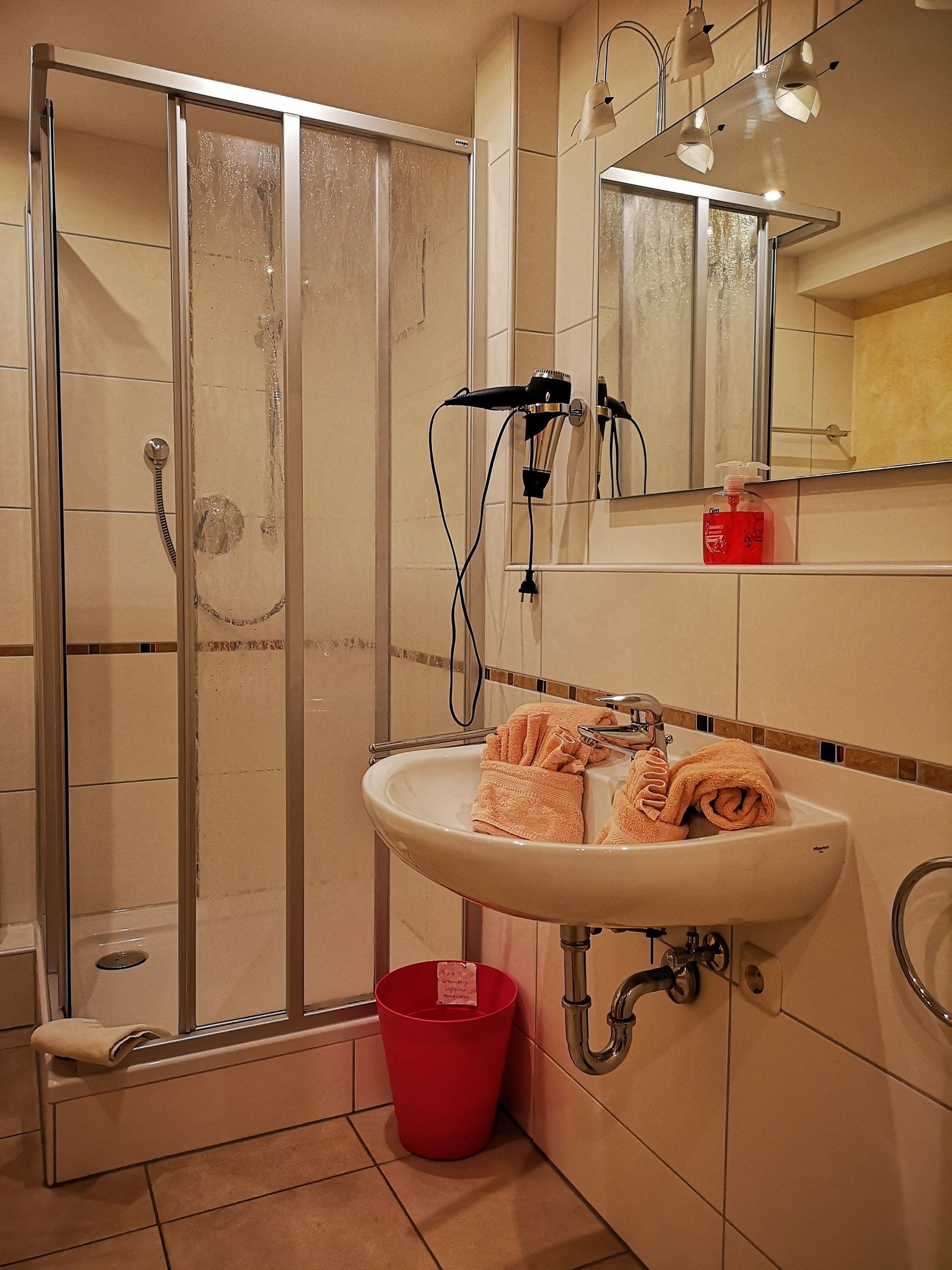 - Ein Bad mit Waschbecken, Dusche, WC, Bidet, Badheizkörper als Handtuchtrockner, Fön
